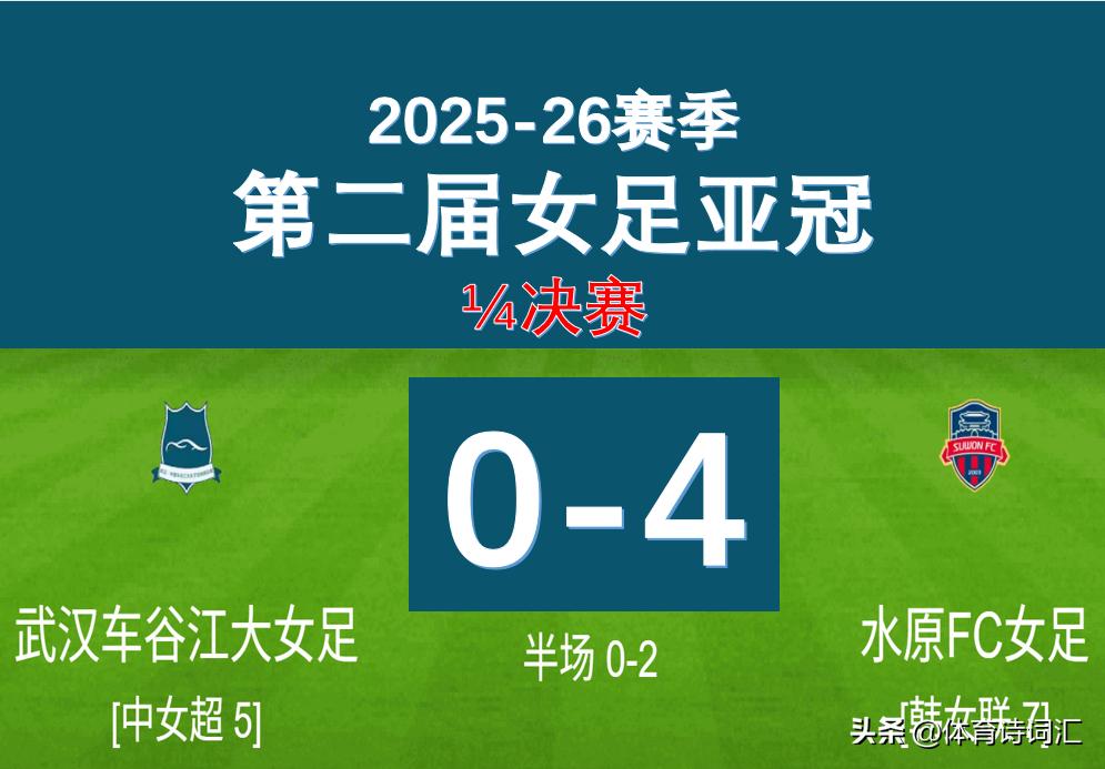 第二届女脚亚冠正在本月展开了四分之一决赛的四场对决,卫冕冠军武汉女脚正在从场汉口体裁核心,全队形态表欠安,以0-4不敌韩国的水原女脚,无缘半决赛。